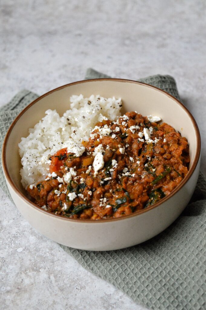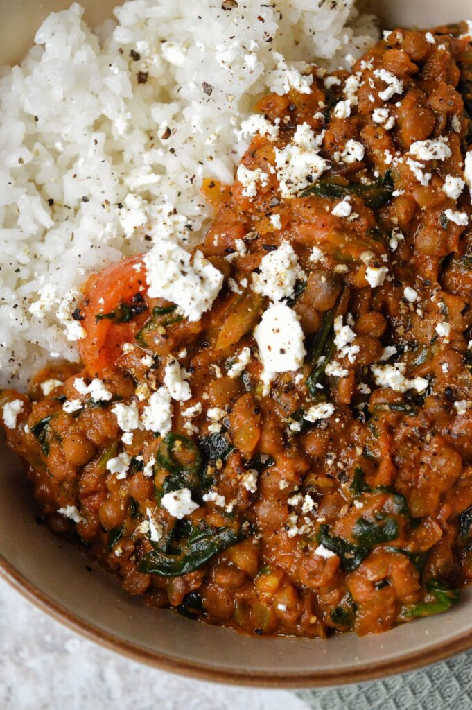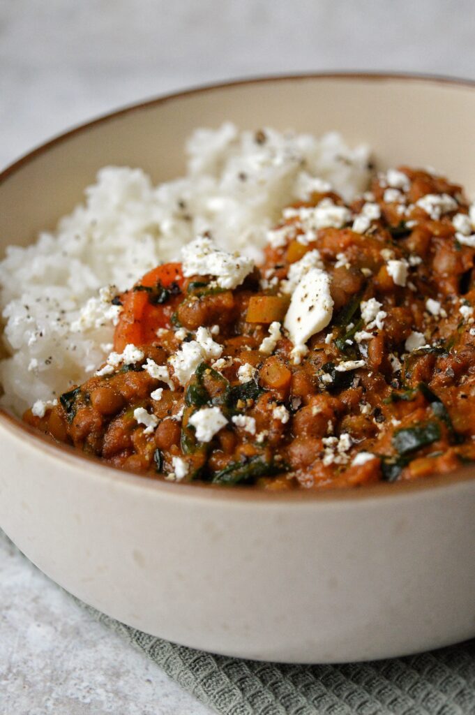 Servera med ris eller annat gryn och smulad fetaost.