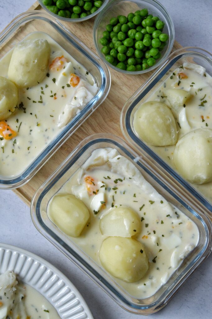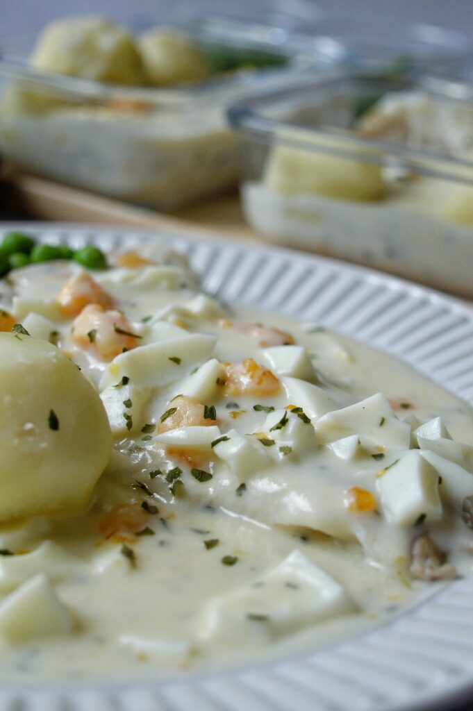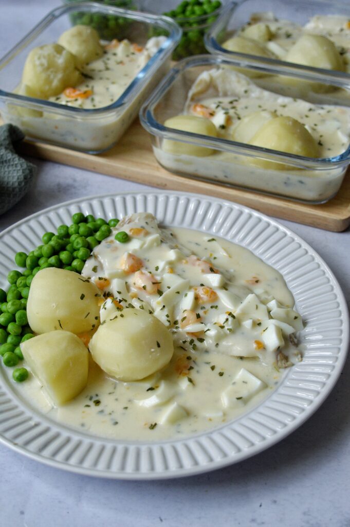 Servera fisken och äggsåsen med kokt potatis och valfria grönsaker.