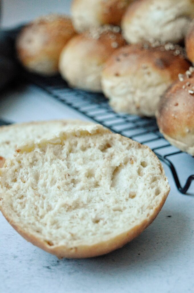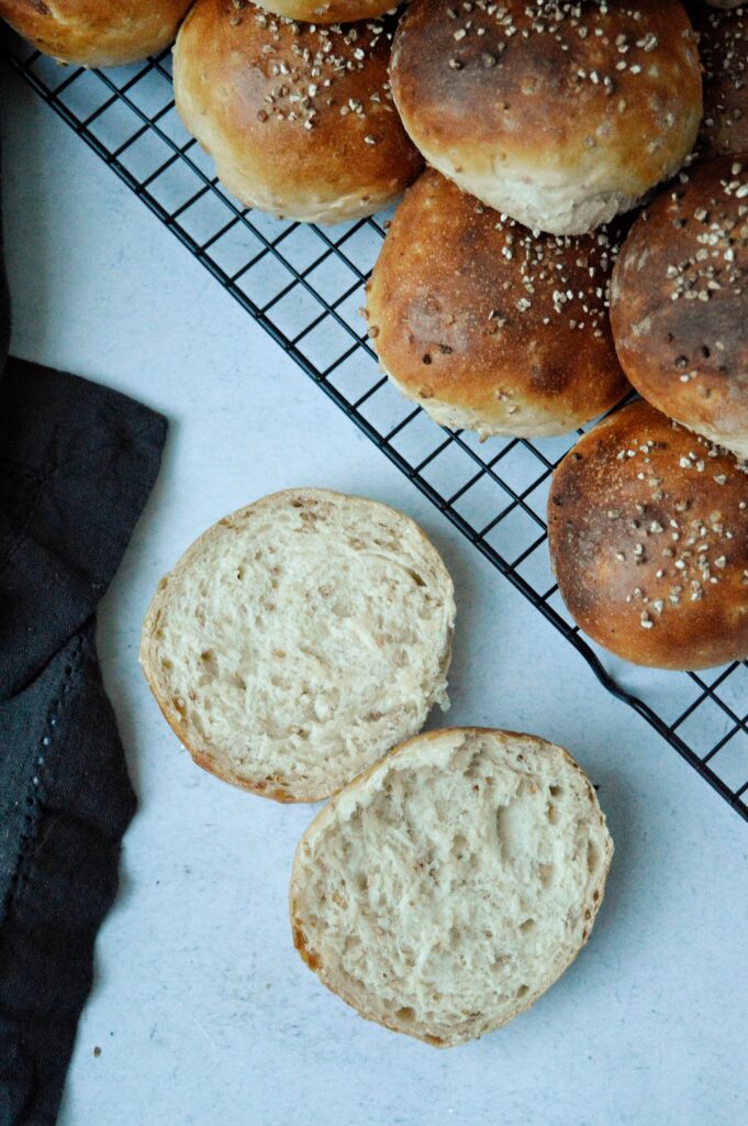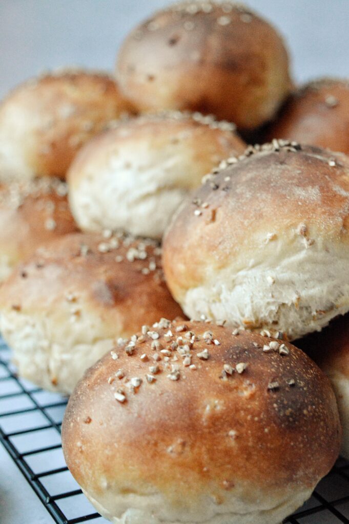 Matbröd bakar jag gärna, tyvärr är jag lite dålig på det i perioder. Dessa går även bra att kalljäsa under natten för att sen grädda och äta nybakade till frukosten. Se då till att vetekross”gröten” får svalna helt och använd kall degvätska. Baka ut till frallor direkt och lägg på plåt med bakduk och ställ i kyl under natten. Ta fram på morgonen och låt stå i rumstemperatur medans ugnen blir varm!