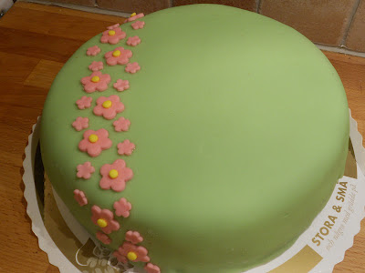 Tårtan är täckt med marsipan och blommorna är gjorda i sugerpaste.