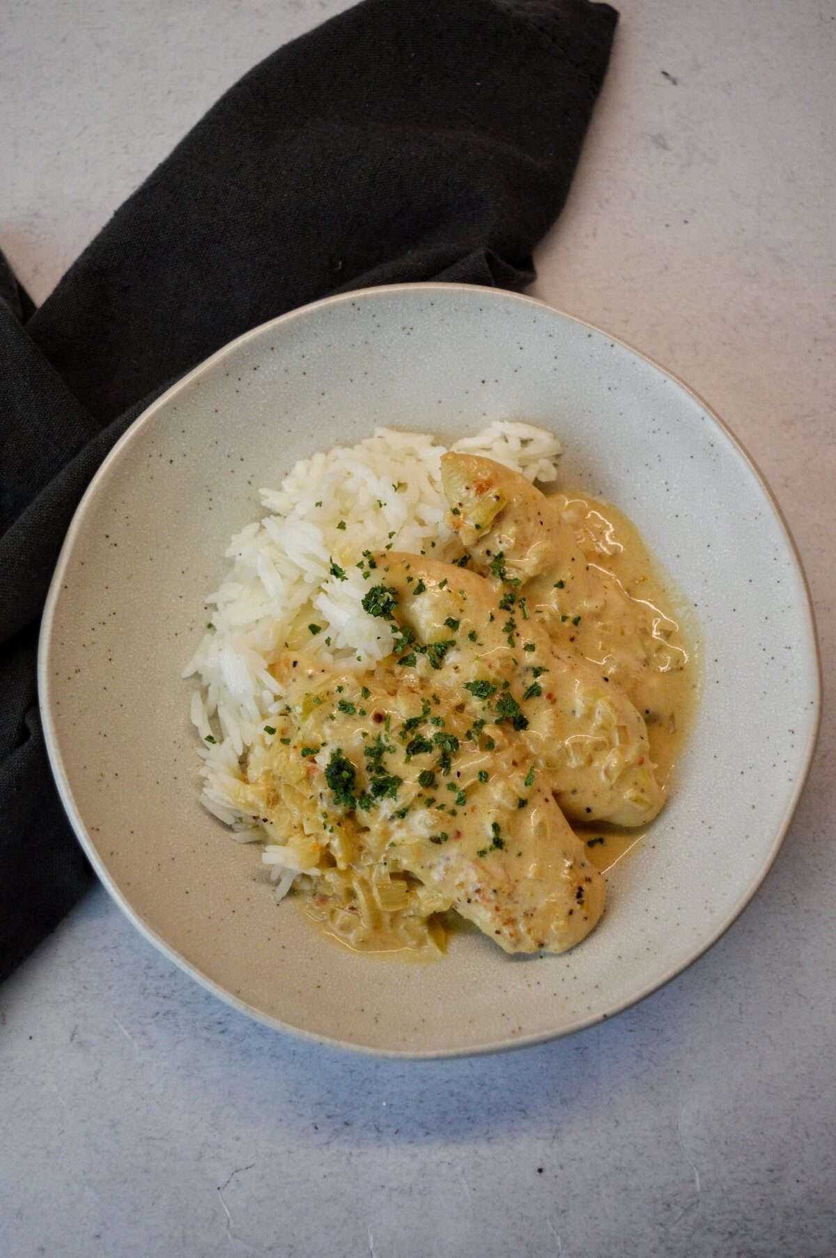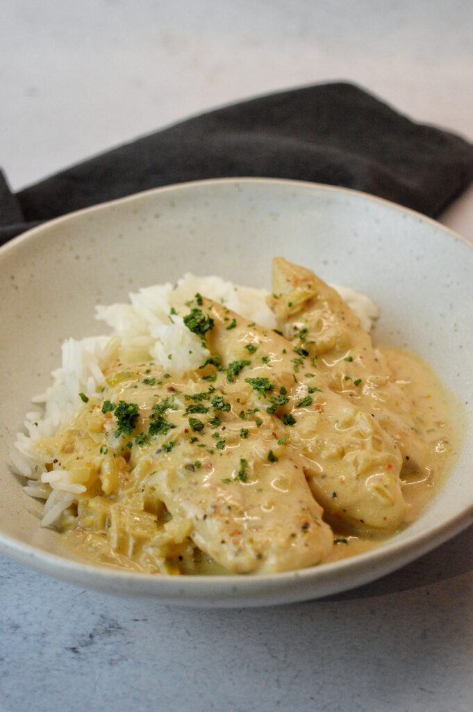 Blanda ner kycklingen och blanda i fond, grädde och färskosten.