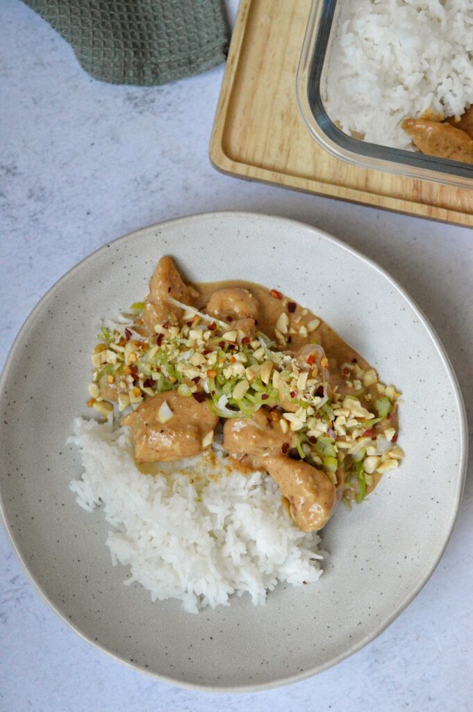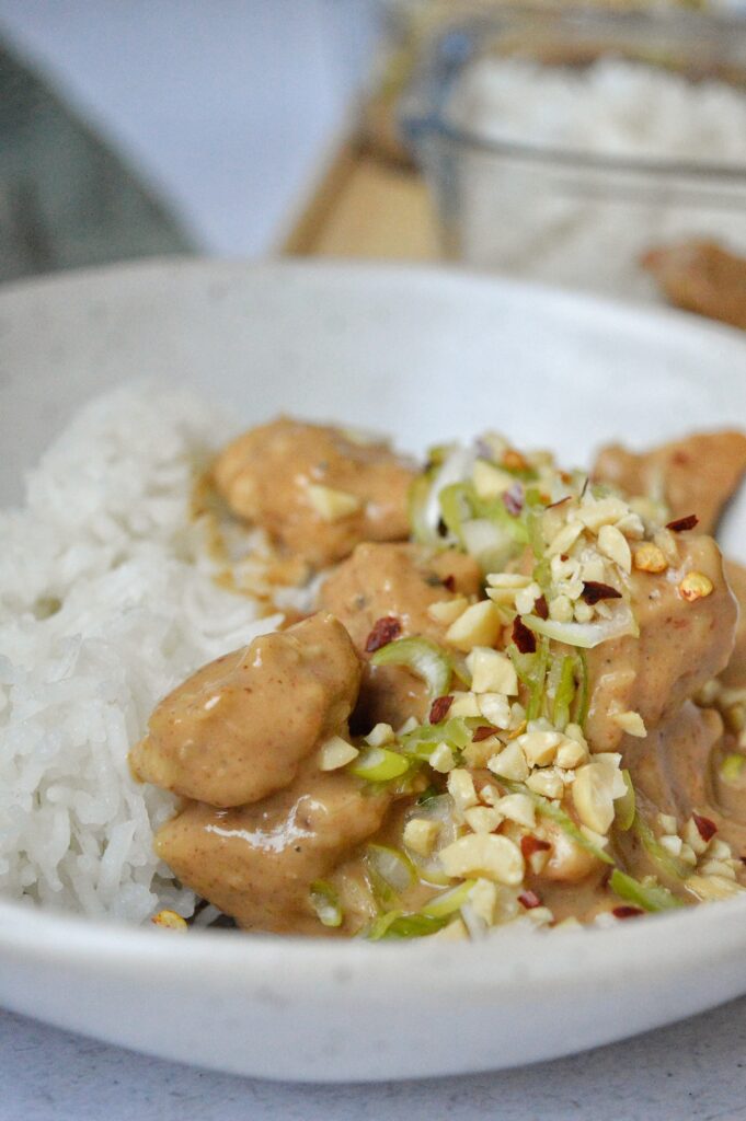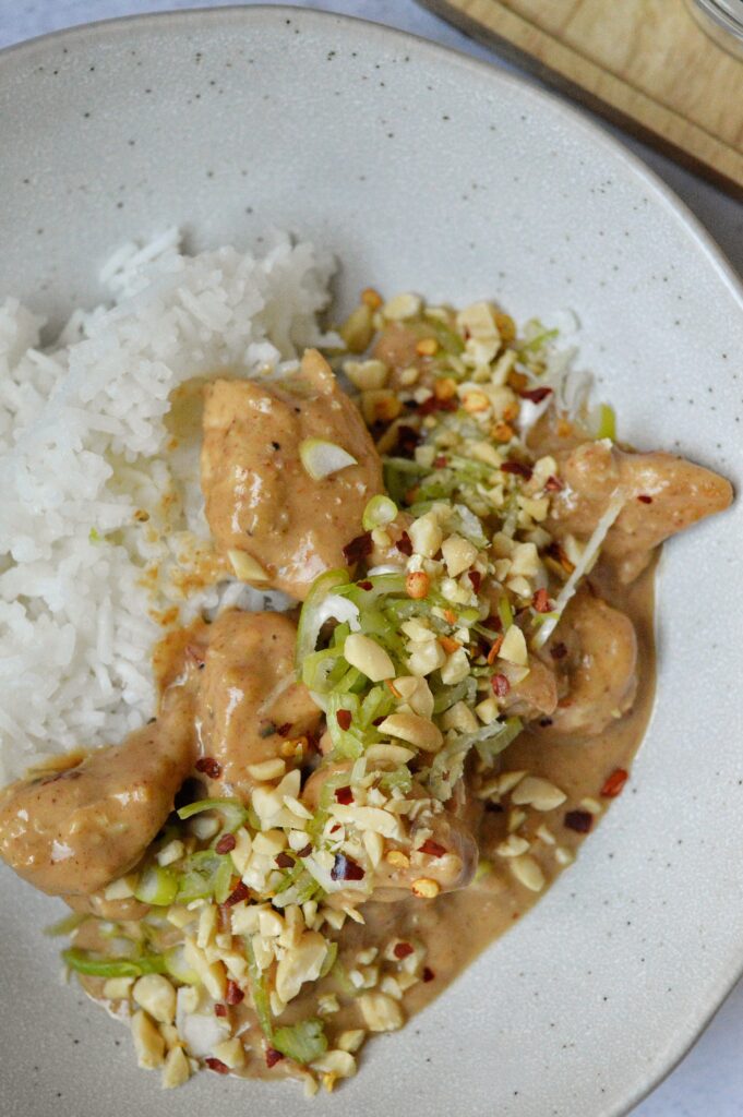 Strimla salladslöken och finhacka jordnötterna och toppa kycklingen med detta vid serveringen med det nykokta riset.