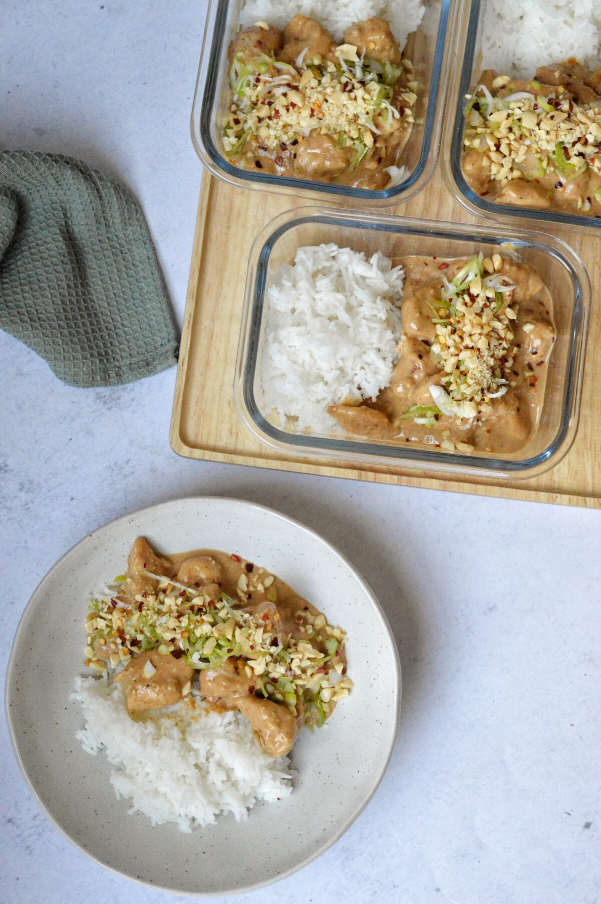 Strimla salladslöken och finhacka jordnötterna och toppa kycklingen med detta vid serveringen med det nykokta riset.